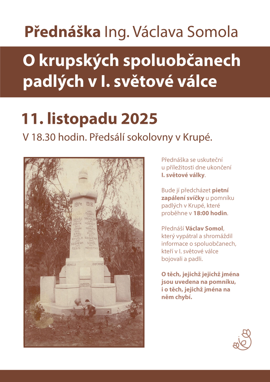 11. listopadu 2022 svolal Historický spolek v Krupé v pořadí již čtvrté setkání k uctění památky padlých v První světové válce. Je dobře, že se z této piety stává tradice, byť většina z nás má toto datum převážně spojené se sv. Martinem (husa a svatomartinské víno).