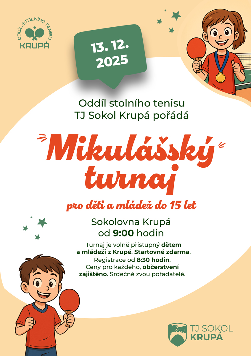 na Mikulášský turnaj, který se koná 13. 12. 2025 v sokolovně Krupá. Registrace probíhá od 8:30 hodin. Občerstvení a ceny zajištěny. Startovné zdarma. Přijď si pinknout 🥰.